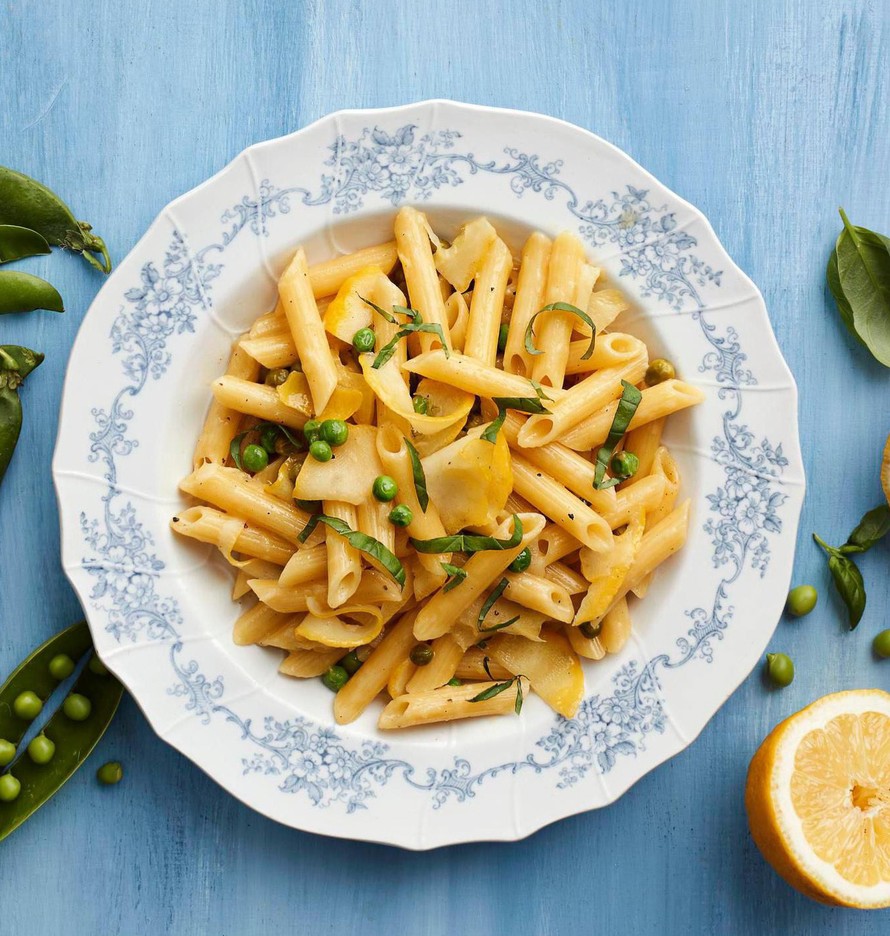 Kirpeää sitruunaa ja ruskistettua voita, mitäpä muuta ihminen kesäpastaansa kaipaisi? Makeat tuoreet herneet ovat ihania sattumia pastan joukossa.