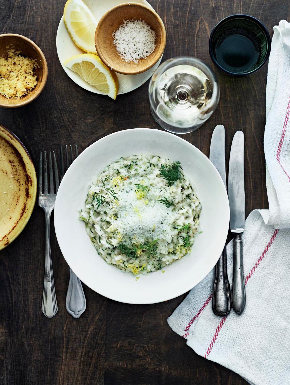 Sekoita voi, parmesaani, sitruunan mehu ja kuori kypsään risottoon. Lisää tilli ja pippuri. Maista ja mausta tarvittaessa suolalla. Viimeistele annokset parmesaanilla ja tillillä.