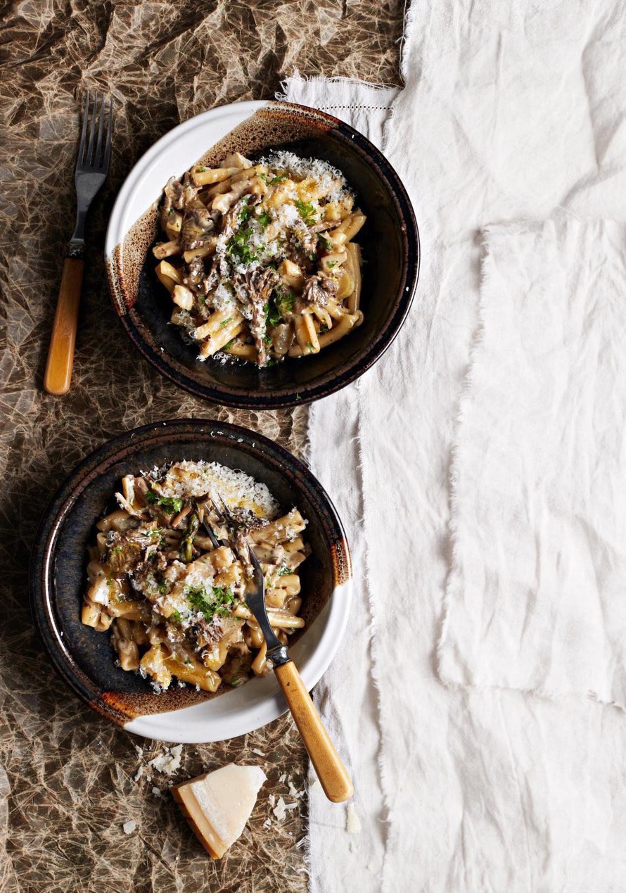 - Keitä pasta pakkauksen ohjeen mukaan. Ota desilitra keitinvettä talteen. Sekoita valutettu pasta ja keitinvesi sienikastikkeeseen.