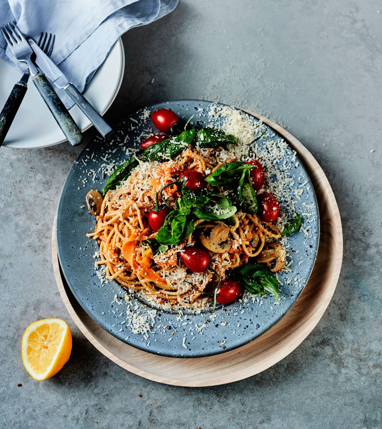 - Valuta nauhapasta lävikössä ja kaada takaisin kattilaan. Sekoita pastan joukkoon tahiniseos. Nostele joukkoon porkkanapaistos. Lisää kirsikkatomaatit ja basilikanlehdet. Raasta päälle parmesaania.