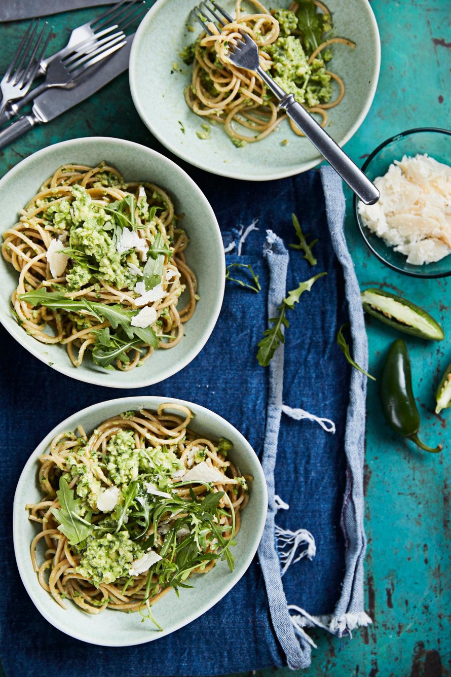 - Sekoita avokadopesto spagetin joukkoon. Silppua pinnalle loppu rucola. Tarjoa pasta parmesaaniraasteen kanssa.