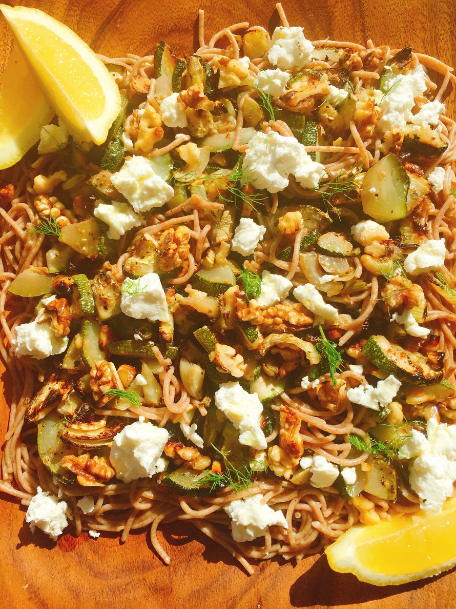 Uunissa paahdetut luomukesäkurpitsa ja -fenkoli maistuvat herkulliselle pastan kaverina. Tämän nopeasti ja helposti valmistuvan makuelämyksen viimeistelevät täyteläinen luomuvuohenjuusto, rapeat saksanpähkinät ja pirskahteleva sitruuna.