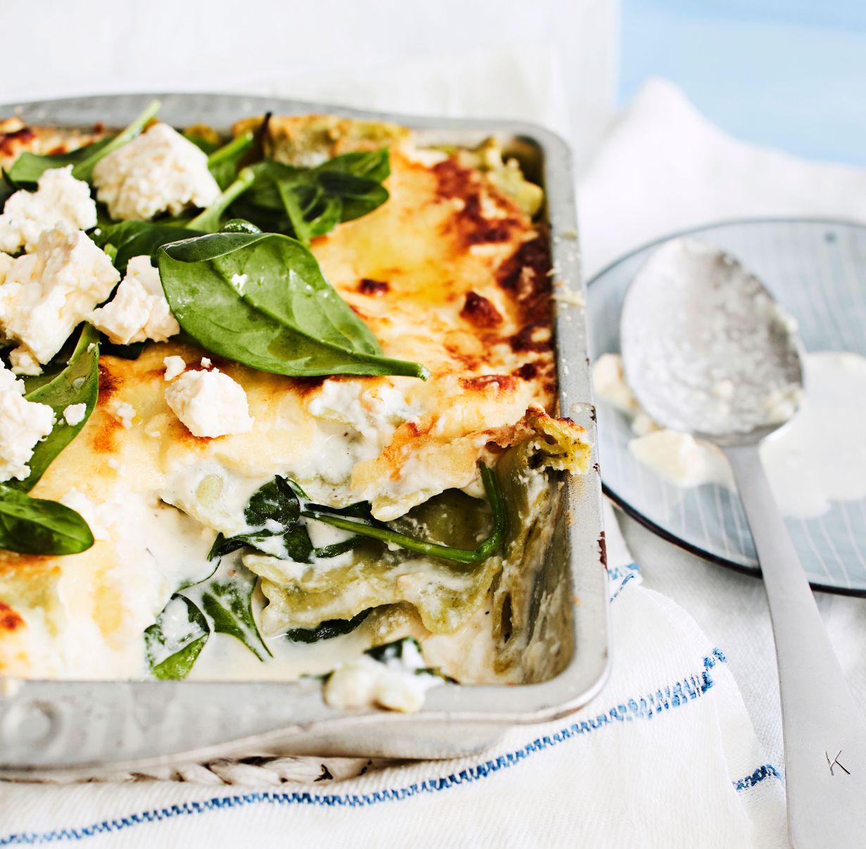 Pinaatilla ja fetalla täytetty uuniravioli ei vaadi aikaa vieviä työvaiheita. Kokoa vain ainekset vuokaan ja käytä pasta uunissa.