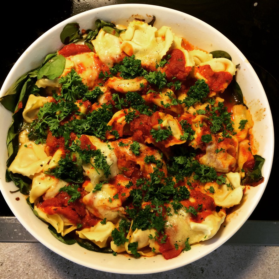 Tämän ruuan onnistuminen muuten riippuu olennaisesti käyttämiesi raaka-aineiden laadusta. Siksi korostan: osta hyviä tuoretortellineja, maukasta mozzarellaa ja etenkin LAADUKASTA VALMISPASTAKASTIKETTA. Ei siis tomaattimurskaa vaan sellaista lasipurkissa myytävää valmista kastiketta.
