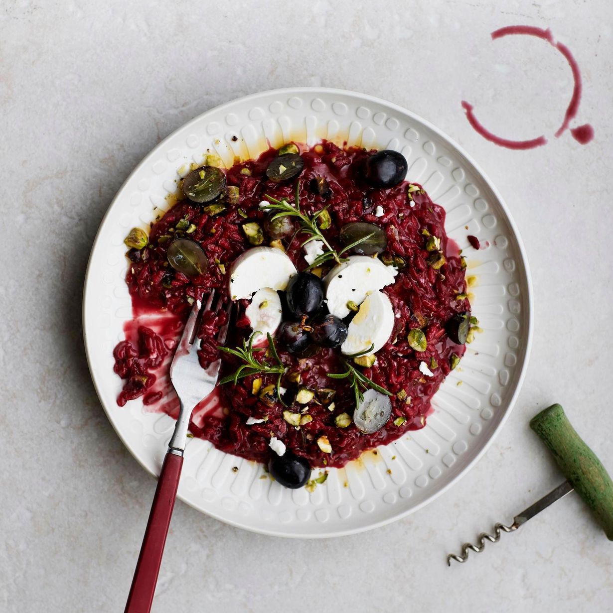 Upean värinen risotto saa syvyttä vuohenjuustosta ja rosmariinista, ja se viimeistellään tummilla rypäleillä ja pistaaseilla.