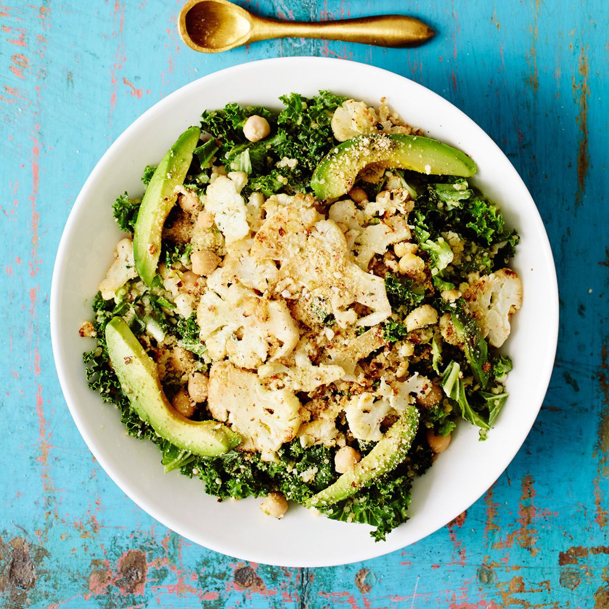 - Halkaise avokado, poista kivi ja lohko hedelmäliha. Sekoita jäähtynyt kvinoa ja valutetut kikherneet kaalinlehtien joukkoon. Sekoita kastike tasaisesti salaatin joukkoon. Ripottele hampunsiemenparmesaani päälle ja koristele kukkakaali-krutongeilla ja avokadolohkoilla.