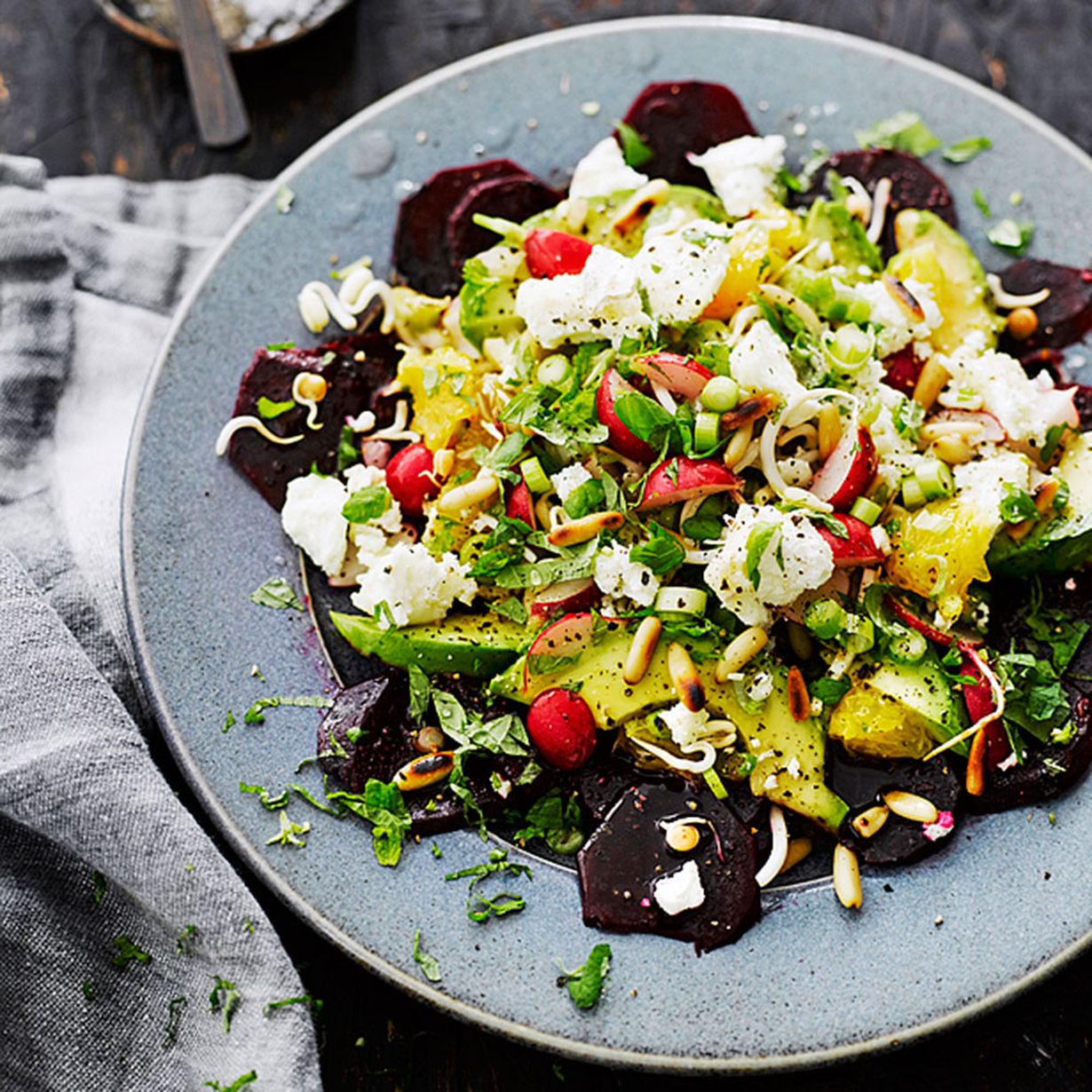 - Asettele punajuuret lautasille, lisää salaatti ja ripottele vuohenjuusto, idut, pinjansiemenet ja minttu pinnalle.