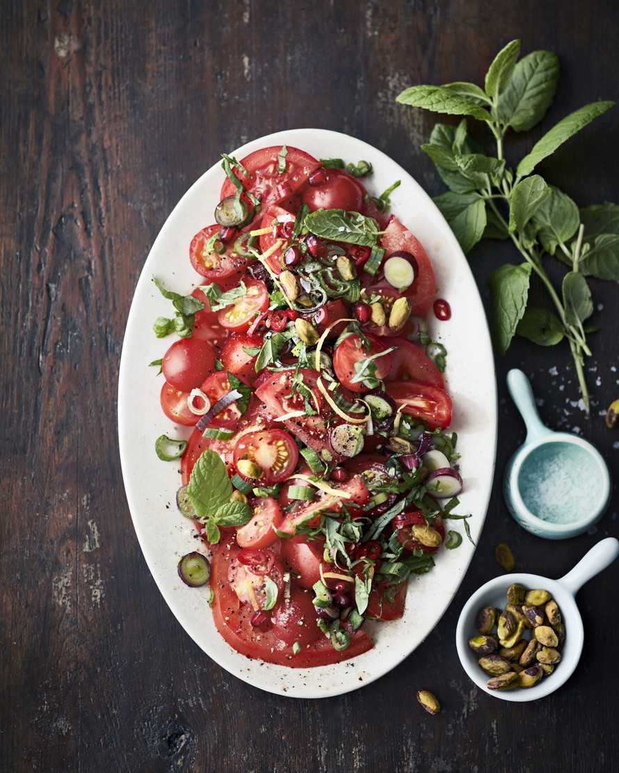 Tomaatin perinteiset makuparit sipuli ja basilika saavat rinnalleen minttua, pähkinöitä ja granaattiomenan siemeniä. Halutessasi ripottele tomaattien leikkuupinnalle suolaa. Se syventää mahtavasti makua.