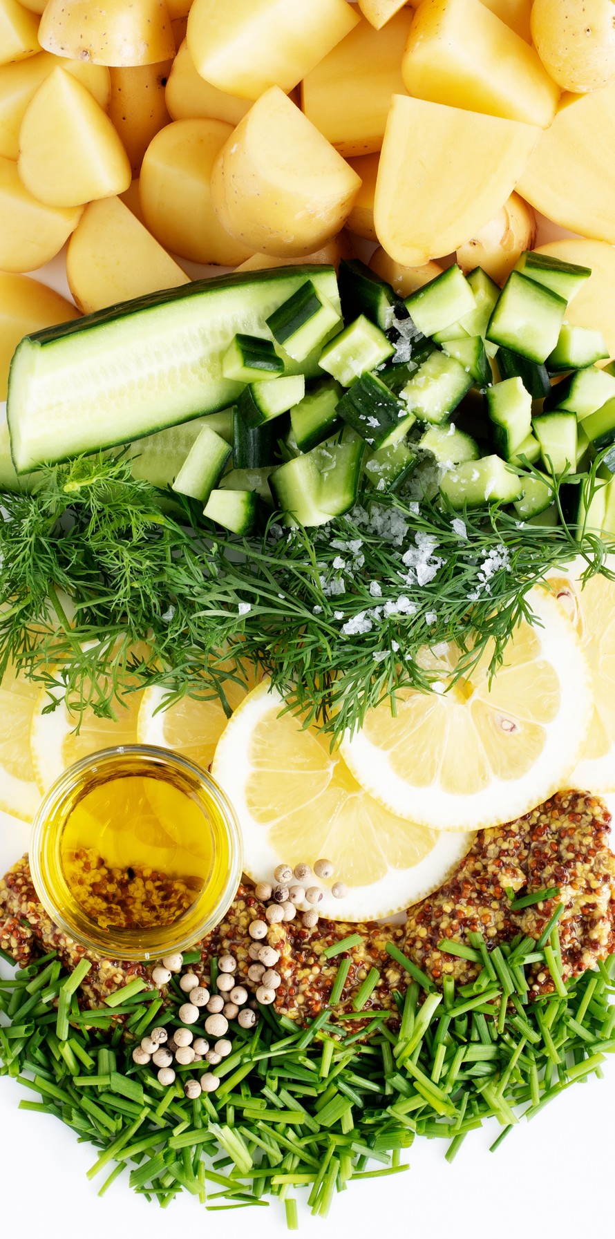 Laita perunat kiehumaan. Halkaise kurkku, koverra siemenet pois ja leikkaa kurkku kuutioiksi. Hienonna tilli ja ruohosipuli.