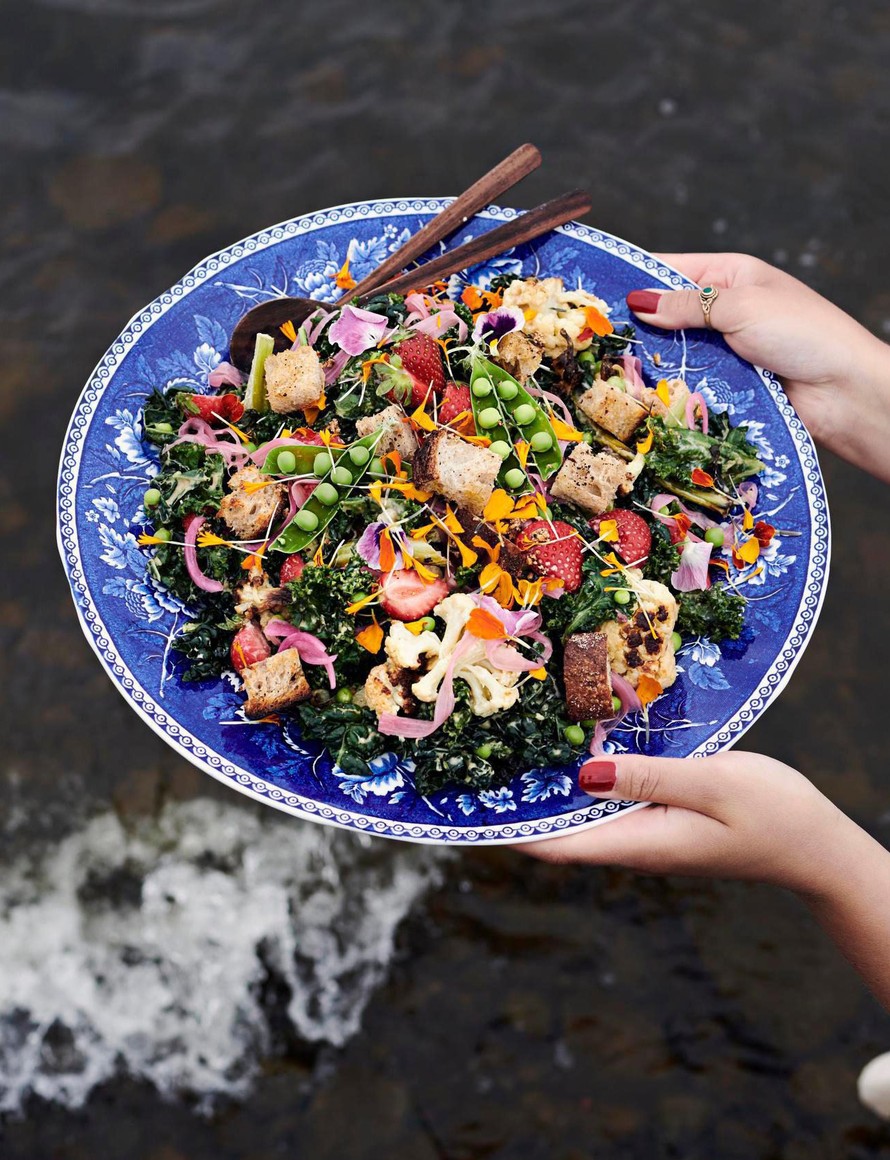 Lehtikaalisalaatin tuoreaineksia voi muokata satokauden mukaan. Kermainen tahinikastike saa umamista makua ravintohiivahiutaleista.