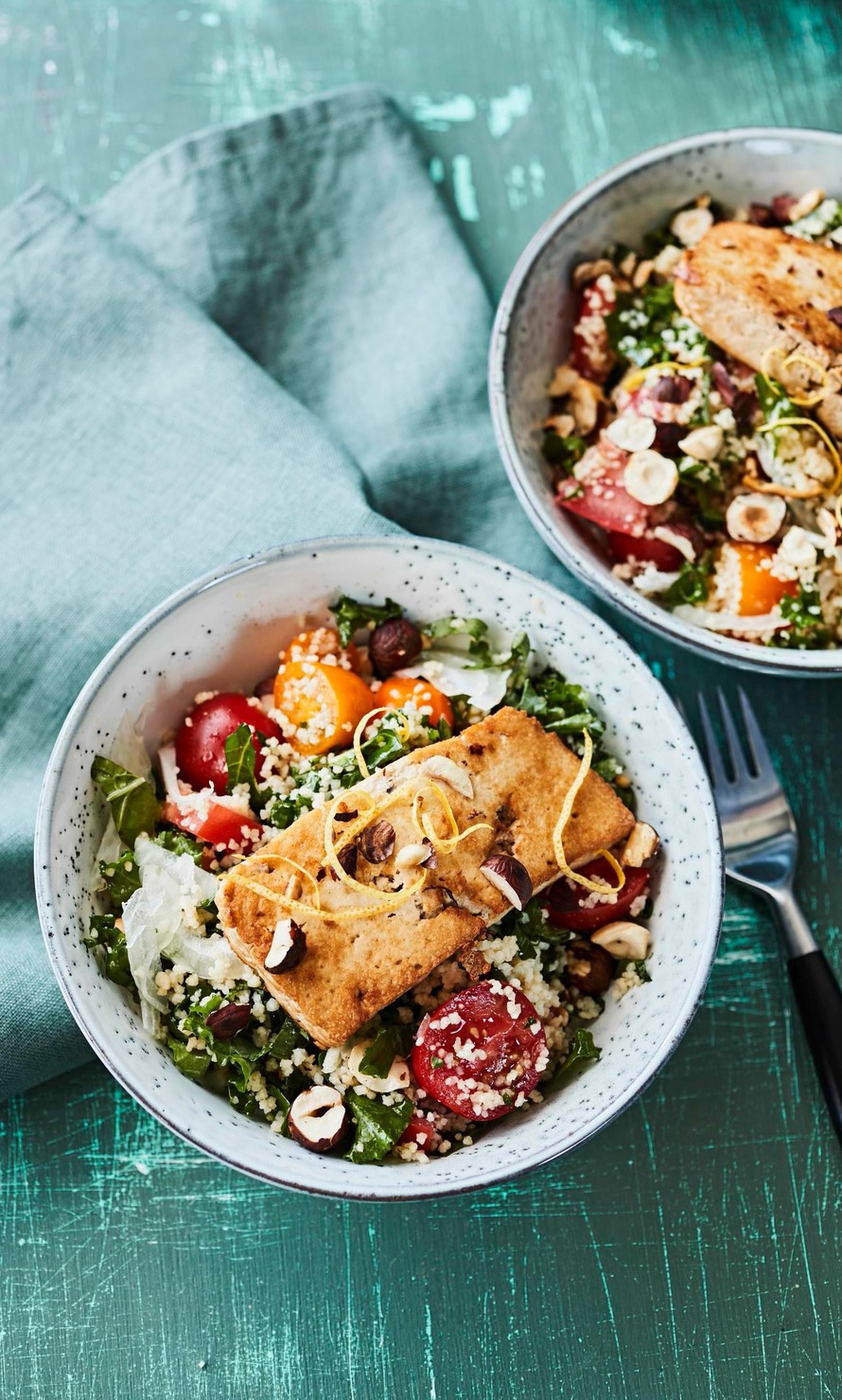 - Lusikoi kuskussalaattia lautasille ja nosta tofupalat annoksen päälle. Rouhi paahdettuja hasselpähkinöitä ja ripottele lopuksi salaatin pinnalle.