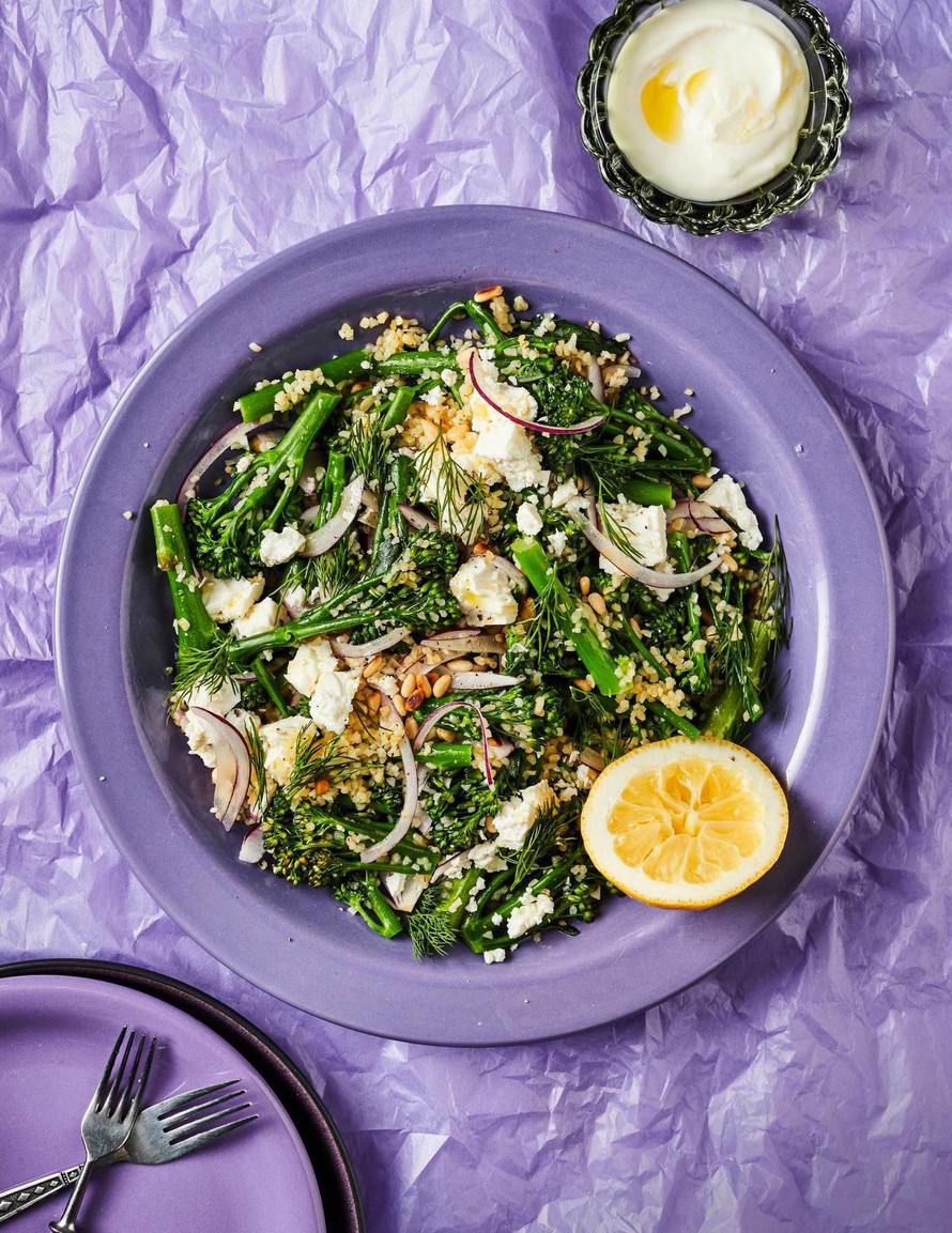 Sitruunaisessa liemessä keitetyt broccolinit saavat seurakseen samassa liemessä keitettyä bulguria, fetaa ja punasipulia. Salaatinkastikkeena voi tarjota sitruunalla ja suolalla maustettua jogurttia.
