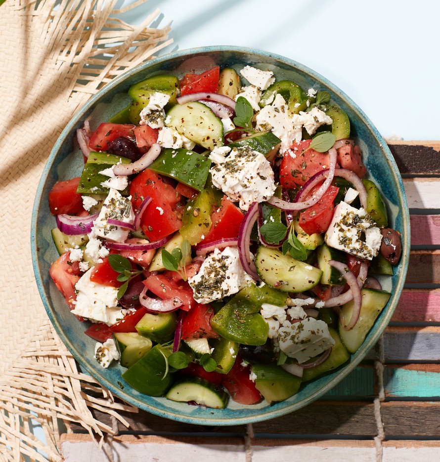 Aito kreikkalainen horiatiki-salaatti valmistetaan ilman lehtisalaattia. Oreganoa saa olla reilusti!