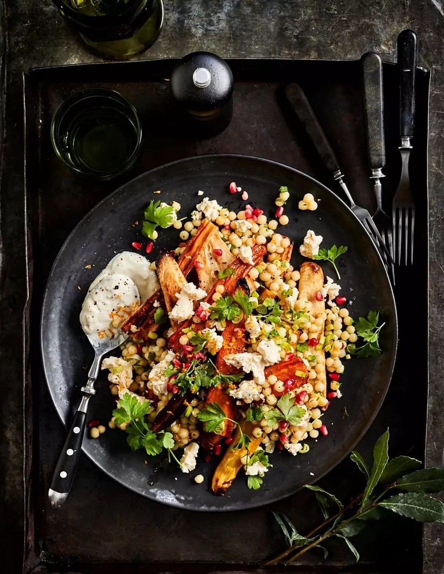 Nosta tarjoilulautasille kasviksia ja kuskusia. Lisää halutessasi joukkoon linssejä, broileria tai lihaa. Viimeistele halutessasi za’atar-mausteella ja granaattiomenansiemenillä. Tarjoa paksun jogurtin kanssa. Jogurtin voi halutessaan maustaa suolalla, pippurilla ja sitruunankuorella.