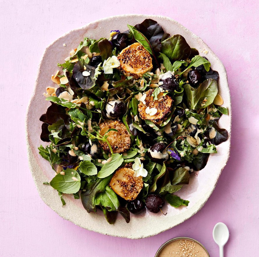 Paistettua vuohenjuustoa, tuoreita kirsikoita ja tahinikastiketta. Tästä ei kesäsalaatti parane!