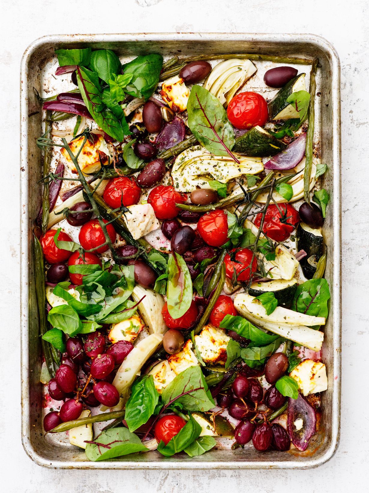 - Levitä vihannekset, fetakuutiot, viinirypäleet ja oliivit laakeaan uunivuokaan.
