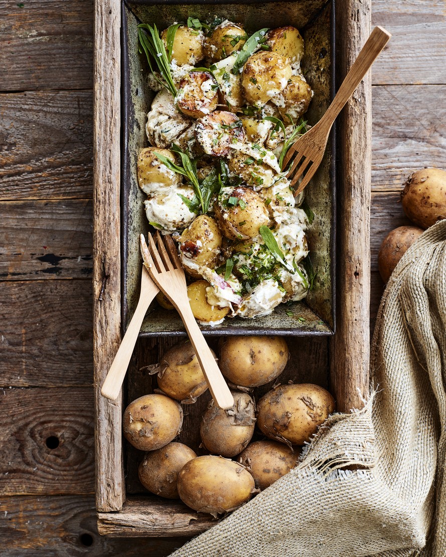 Pannulla ruskistetussa voissa paistetut perunat ovat ihanan klassikkolisukkeen viritetympi versio. Pari suolaista anjovisfileetä, dijoninsinappi ja tuore rakuuna tuovat makuun hienostuneen silauksen. Jos haluat pannusalaatista kasvisversion, korvaa anjovisfileet aurinkokuivatuilla tomaateilla.