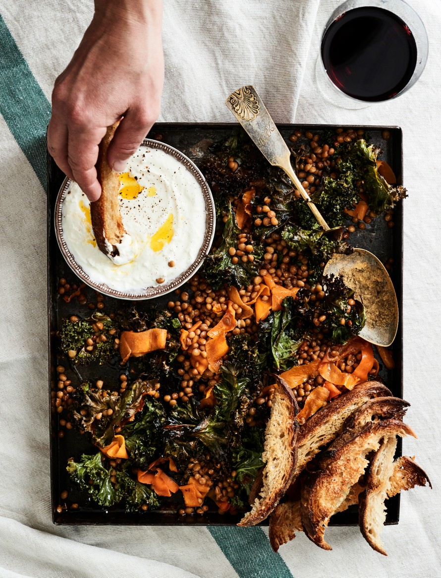 Rapeat leipätikut täydentävät uunissa valmistuvan linssi-lehtikaalisalaatin. Tässä salaatissa on monia koostumuksia ja pehmeä fetadippi täydentää paletin.