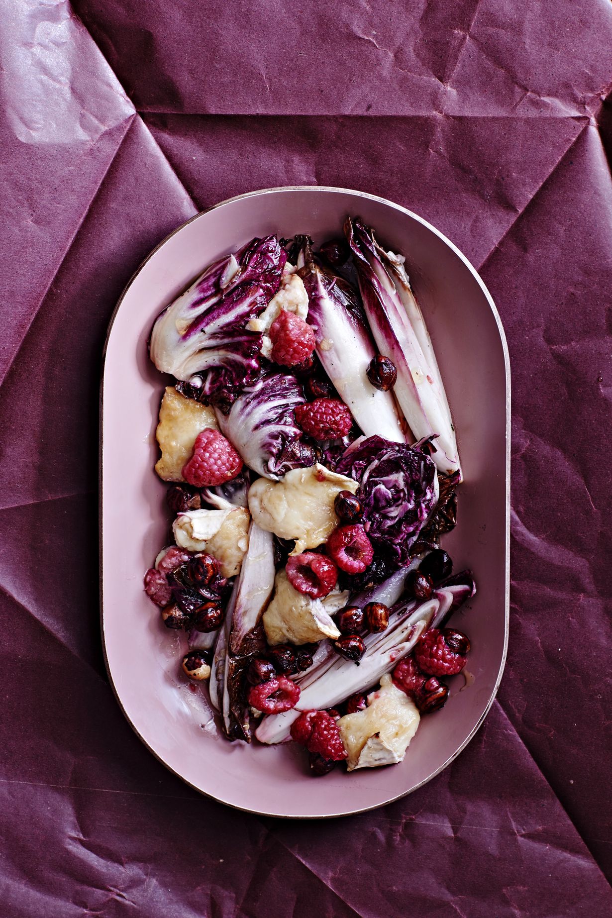 Karvasta, makeaa, hapokasta ja suolaista. Tässä vadelmilla ja vuohenjuustolla höystetyssä sikuri-endiivisalaatissa maut ovat täydellisessä tasapainossa.
