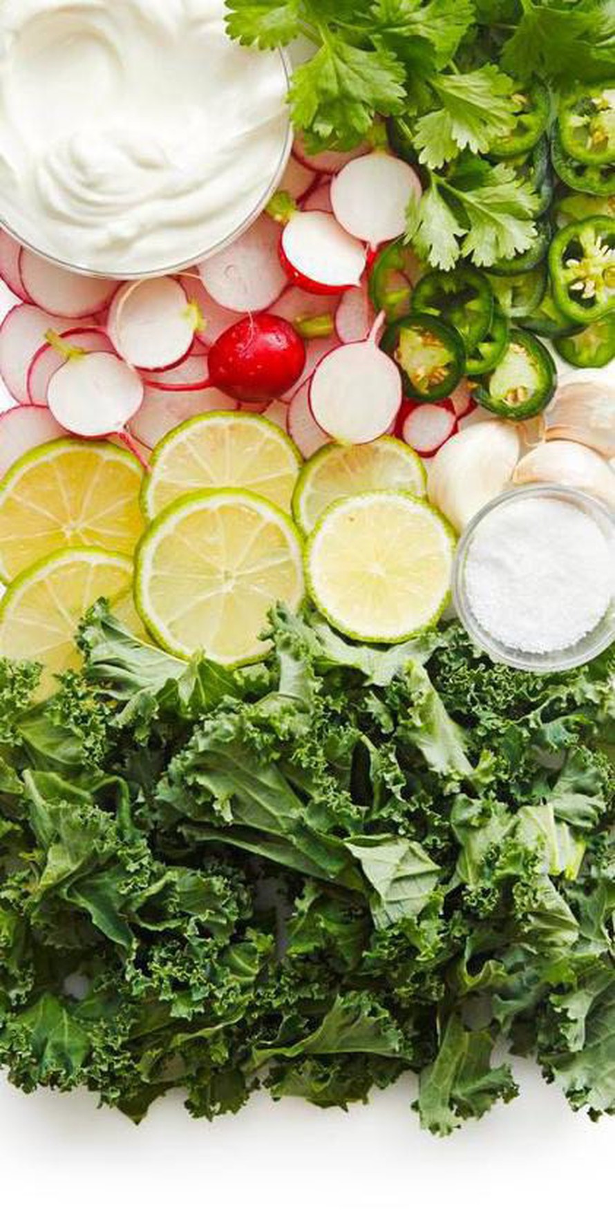 Lehtikaali kannattaa suikaloida hyvin ohueksi ja todella hieroa sitä kunnolla, jotta sen rakenna muuttuu miellyttäväksi. Retiisit, lime ja jalapeno tekevät tästä lisukesalaatista raikkaan.