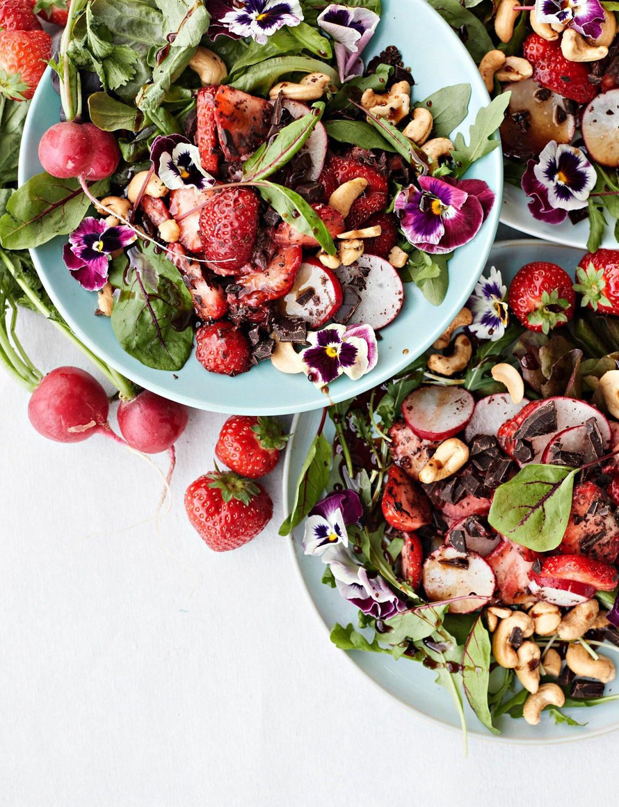 Sekoita yhdessä kulhossa mansikat, retiisit, suklaarouhe ja pähkinät, ja toisessa kulhossa salaatit ja yrtit salaatin pohjaksi. Yhdistä mansikat, salaatit ja kastike juuri ennen tarjoilua. Koristele syötävillä kukilla.
