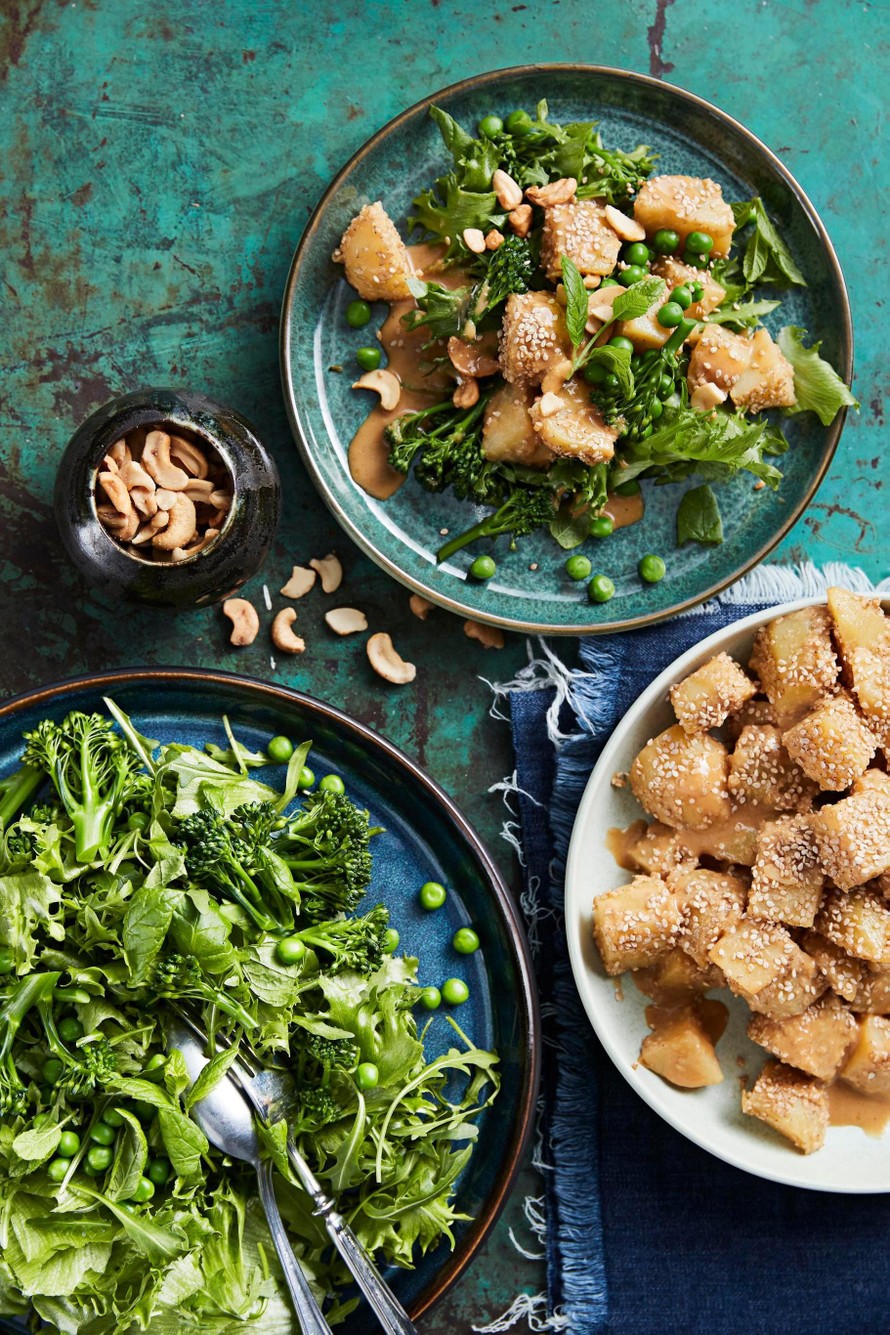 - Kokoa salaatti. Revi jääsalaatti ja rucola kulhoon. Sekoita joukkoon broccoliinit ja herneet. Voit sekoittaa perunat vihersalaattiin tai tarjoilla ne erikseen. Viimeistele salaatti cashewpähkinöillä ja tuoreella mintulla.