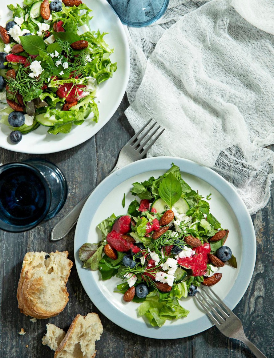 Salaatti maistuu aivan kesältä, kun lataat sen runsaaksi marjoilla ja yrteillä.
