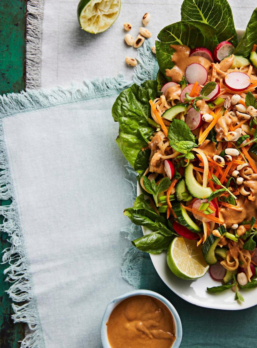 Pehmeä nuudeli ja makea maapähkinätahna janoavat rapeaa seuraa.