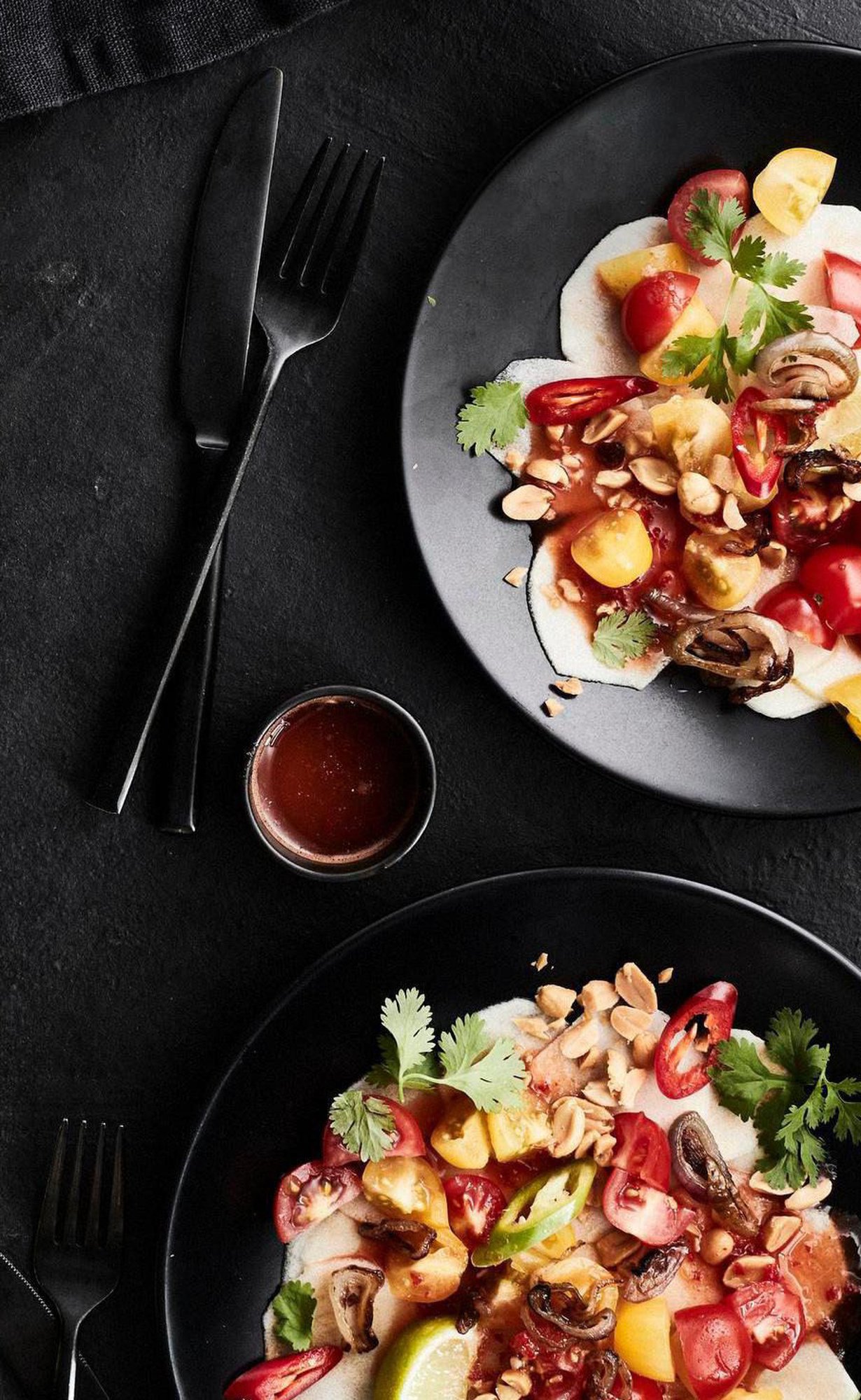 Rouhi päälle suolapähkinöitä ja hienonna korianteria. Lusikoi pinnalle paahdettua sipulia ja pirskota kastiketta tasaisesti päälle.