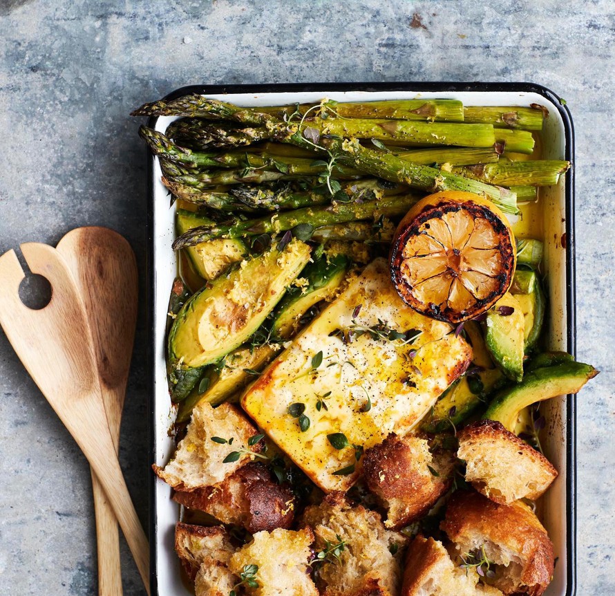 Ihana kevätsalaatti yhdistää paahdetut parsat, krutongit ja uunifetan. Tarjoa herkku uunilämpimänä suoraan pelliltä.