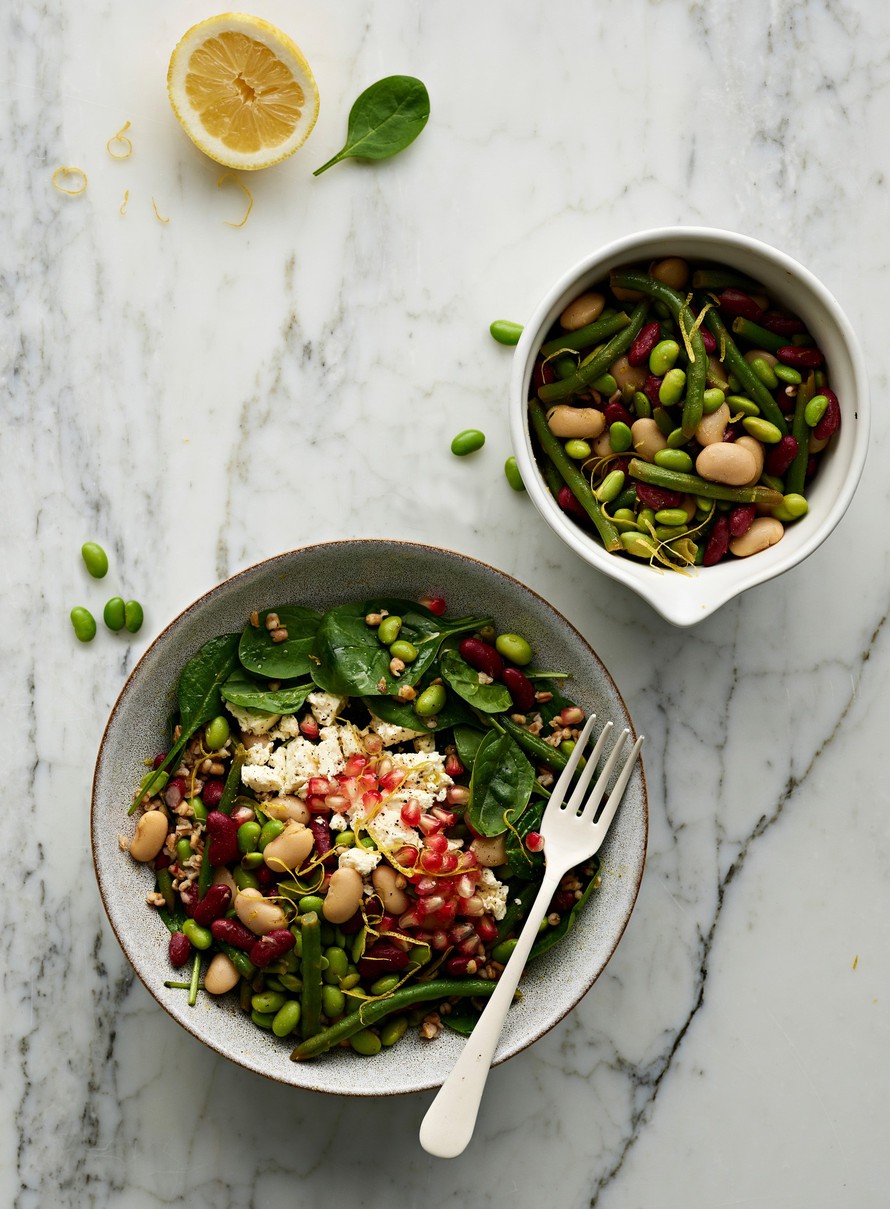 Keitä jäisiä soijapapuja ja vihreitä papuja kiehuvassa, suolalla maustetussa vedessä noin 5 minuuttia. Jäähdytä.