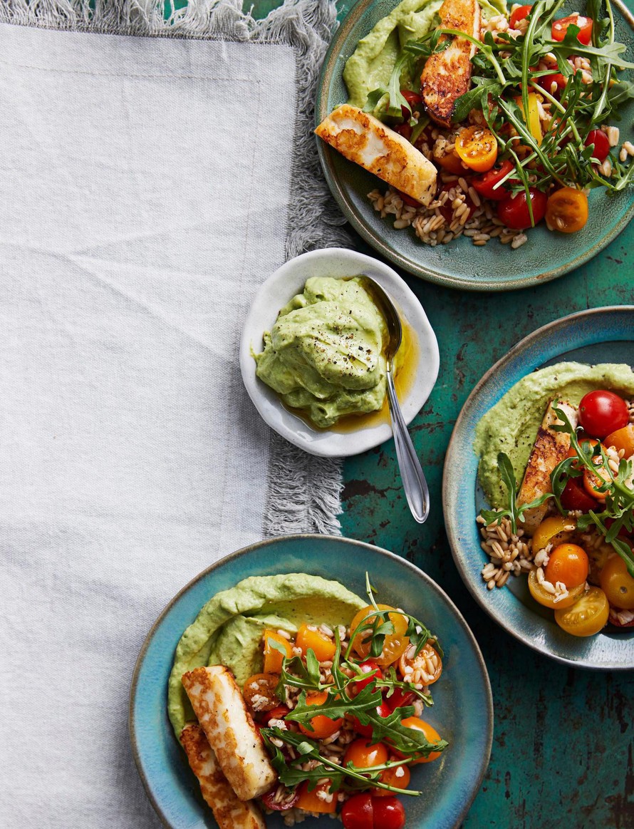 Tomaatti-halloumikulho ja avokadotahna