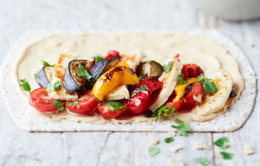 Rullaa tortillan sisään itsetehtyä hummusta, paahdettuja kasviksia ja paistettua halloumia. Tätä parempaa kasviswrapia saa hakea!