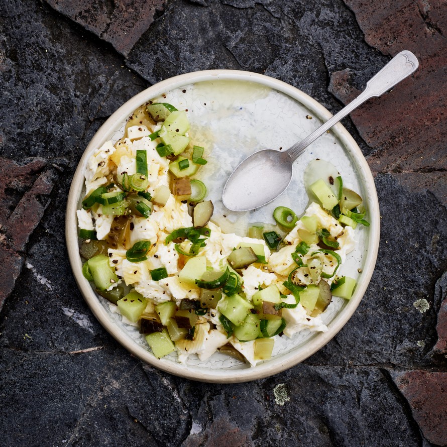 Yhdistä kurkkukuutiot ja kaprikset kulhossa. Hienonna sipulinvarsi ja sekoita se kurkkusalsaan.