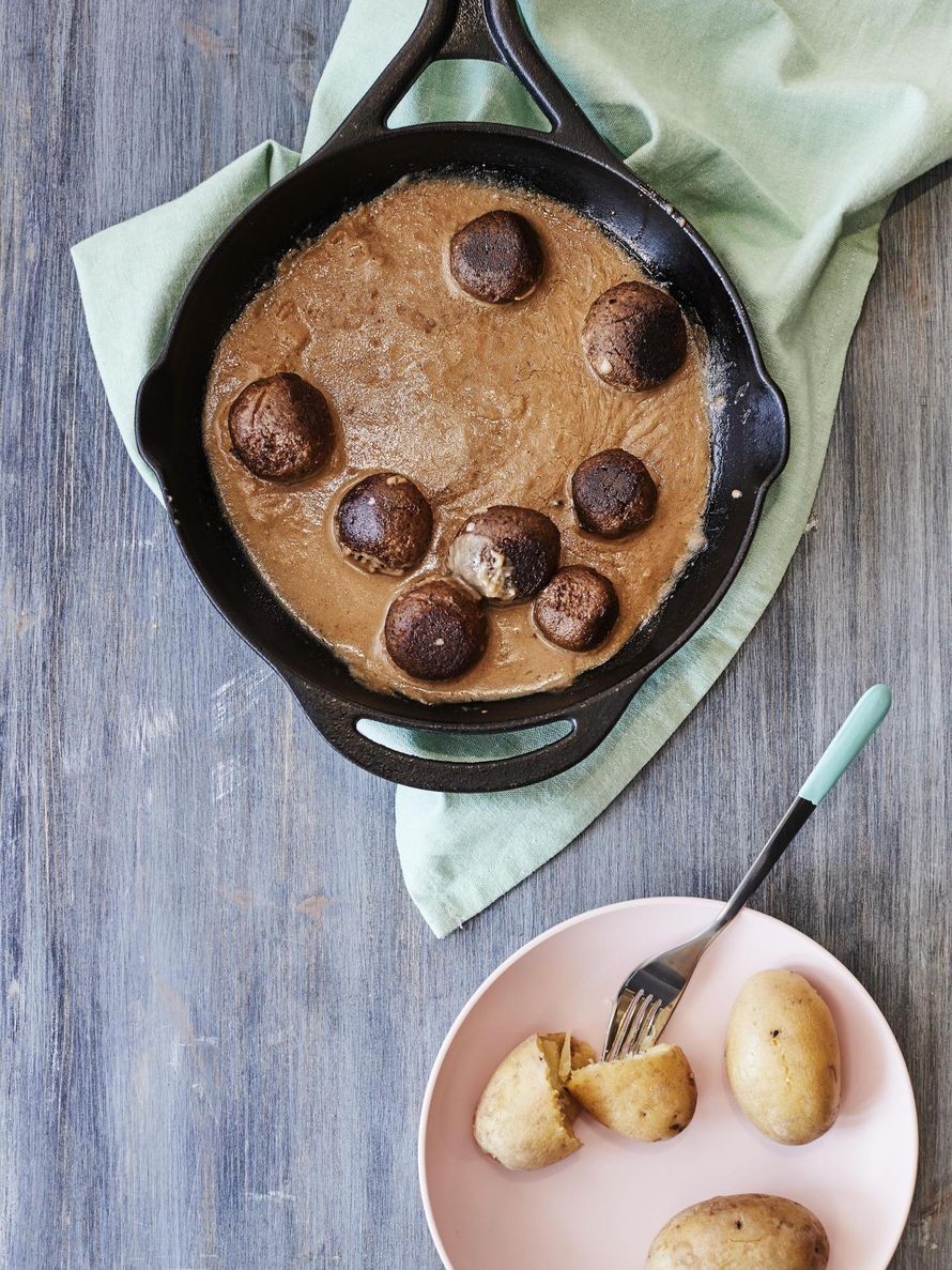 Härkiksestä ja sienistä pyöräytetyt vegaaniset lihapullat ovat niin helppo tehdä, että aikaa kuluu vain puoli tuntia. Niiden kanssa valmistetaan vegaaninen ruskeakastike.