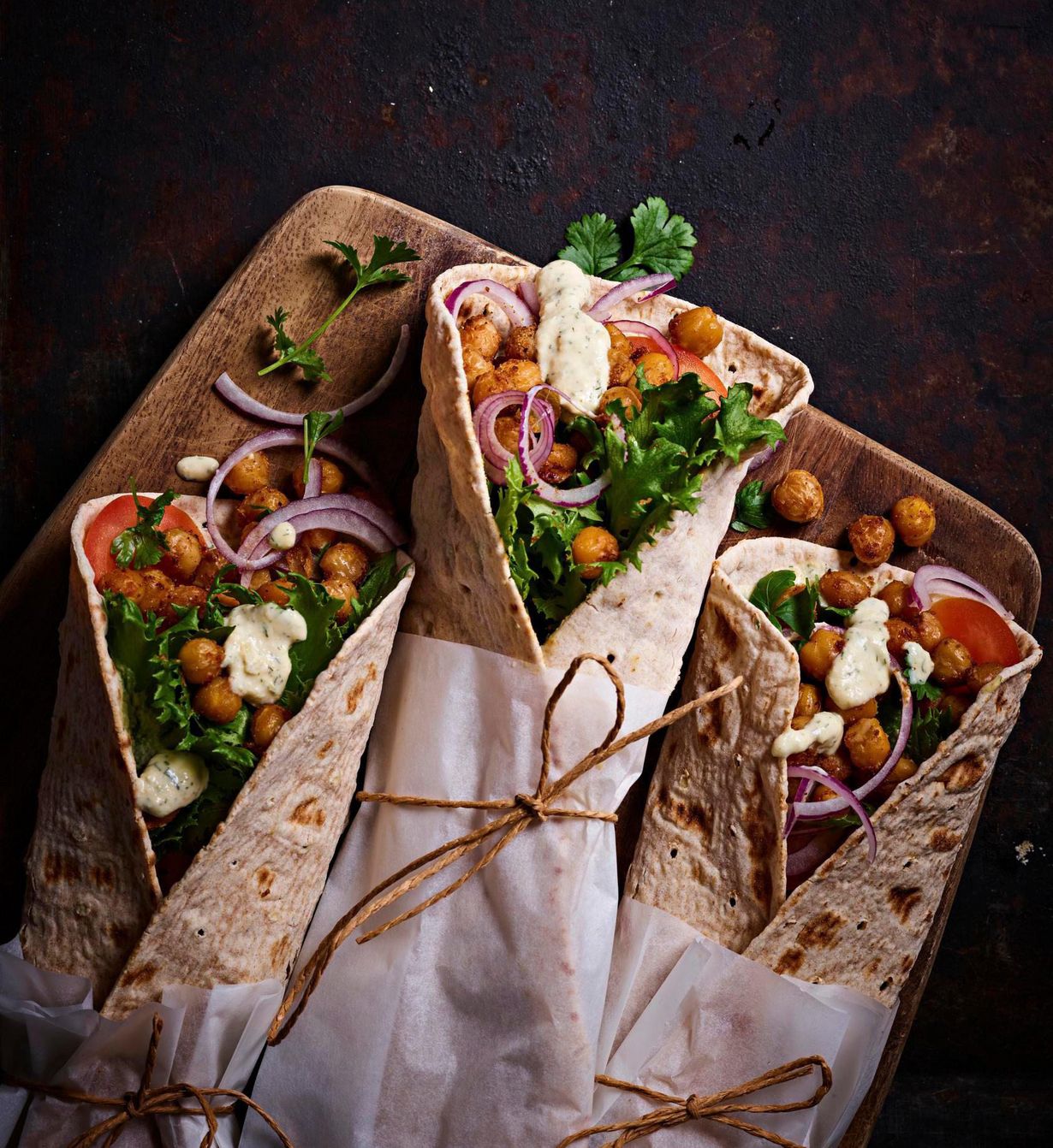 Paahdetuilla kikherneillä, hummuskastikkeella ja kasviksilla täytetty rieska on herkullinen ja ruokaisa paketti. Iso rullarieska taipuu helposti wrapiksi, mutta myös pitaleivät tai pienet rieskat käyvät.