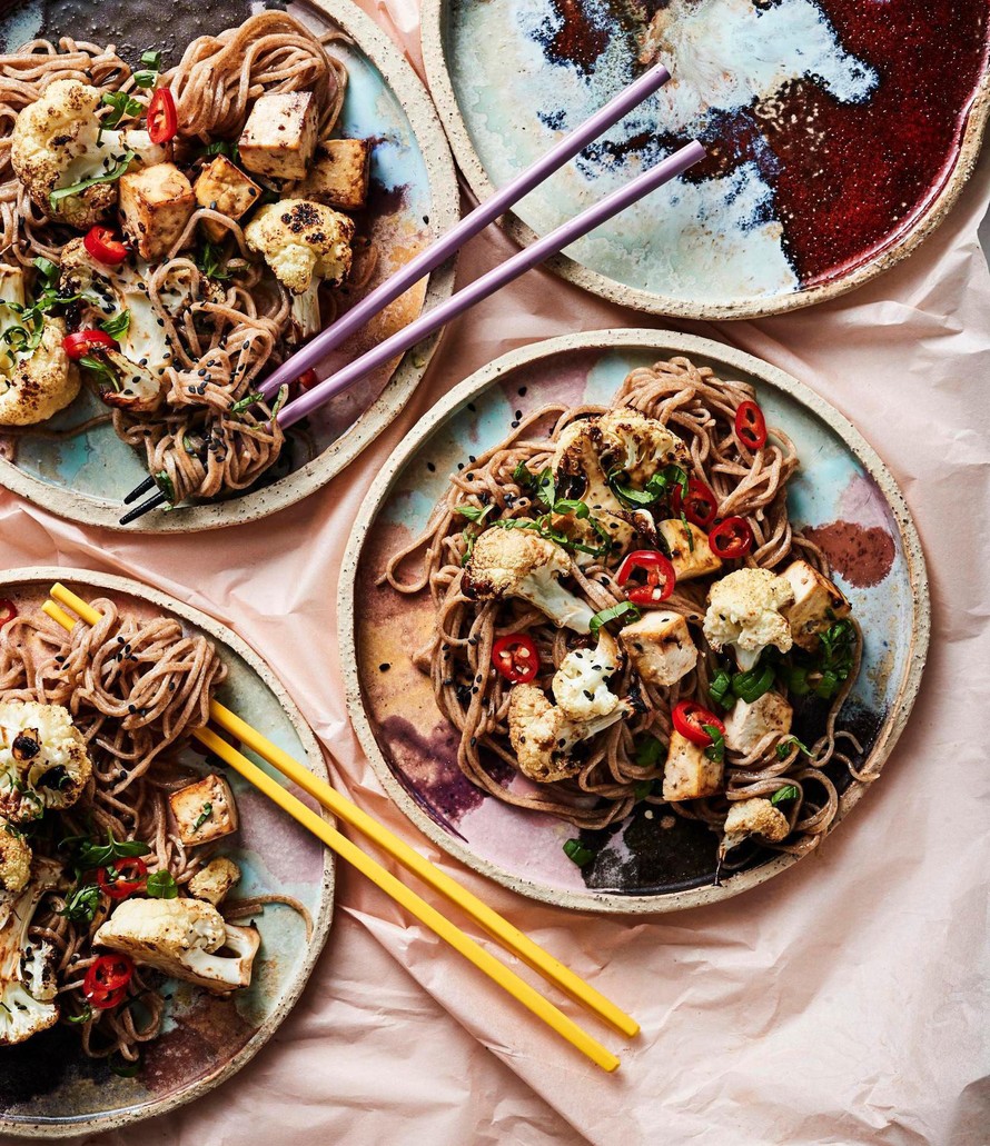 Täysjyvänuudeleiden kanssa tarjottu kukkakaali ja tofu saavat upean maun, kun ne maustaa umamisella misotahnalla ja paahtaa sen jälkeen nopeasti uunissa.