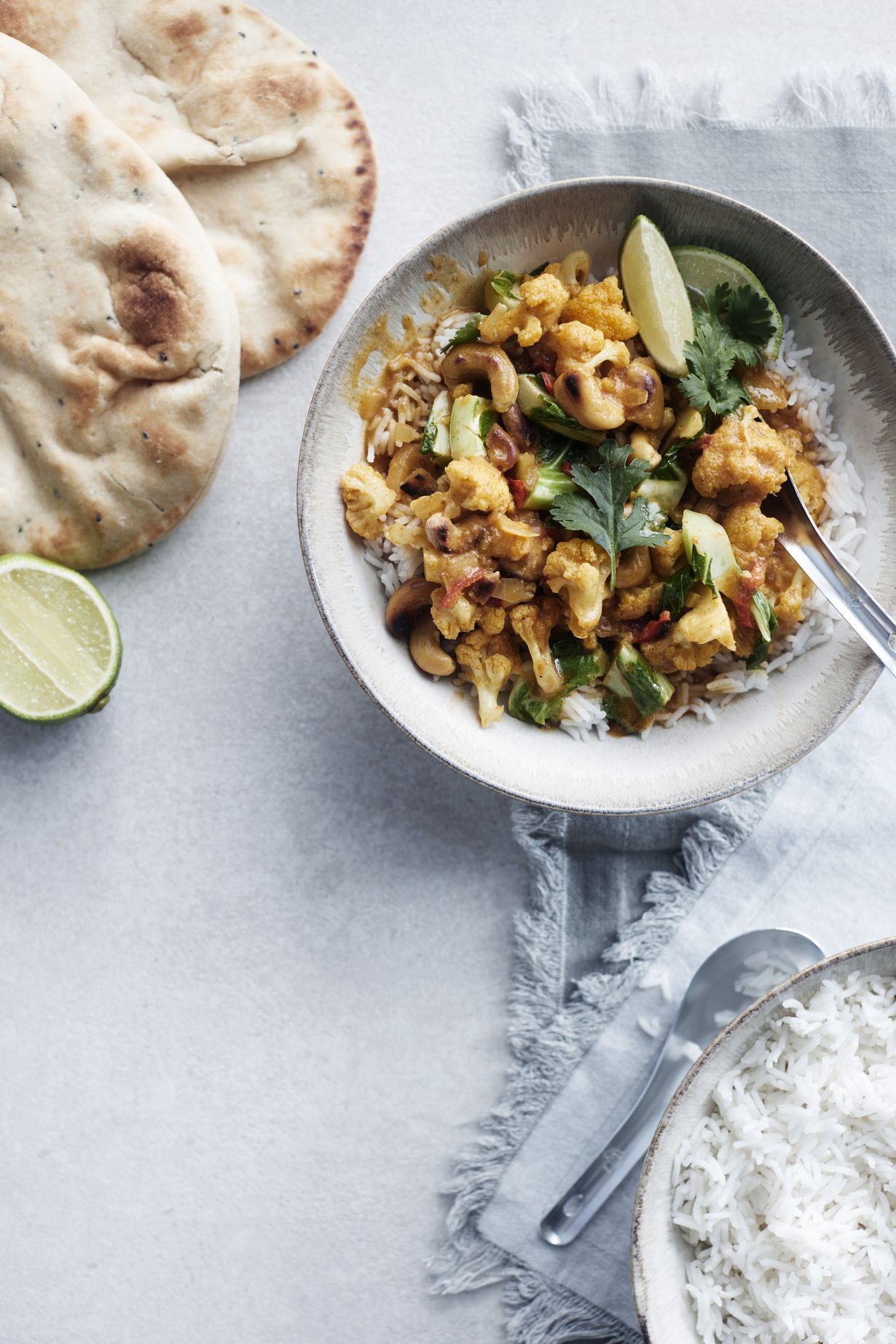 Tarjoa kukkakaalicurryn kaverina basmatiriisiä ja kaupan naanleipää.