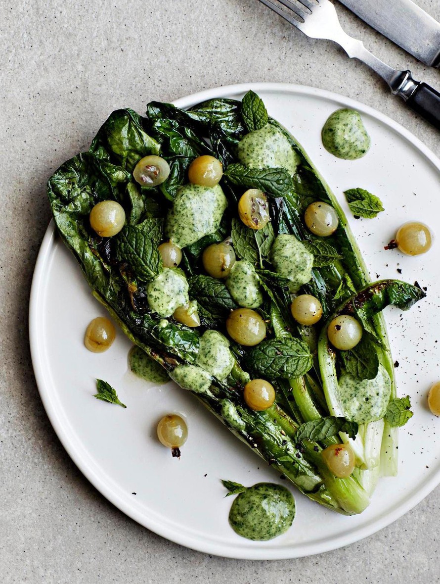 Halkaise romainesalaatti ja sivele leikkauspinnat öljyllä. Grillaa tai paista pannussa, kunnes salaatit ovat saaneet väriä. Nosta lautasille ja mausta suolalla ja pippurilla.