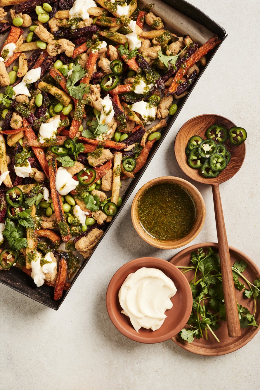 Värikäs ranskalaispelti sopii perjantai-illan herkuksi. Edamamepavut lisätään pellille hieman myöhemmin, etteivät ne kuivu rusinoiksi. Sopivan raikas soosi ranskiksille on runsaan tuoreyrttinen chimichurri .