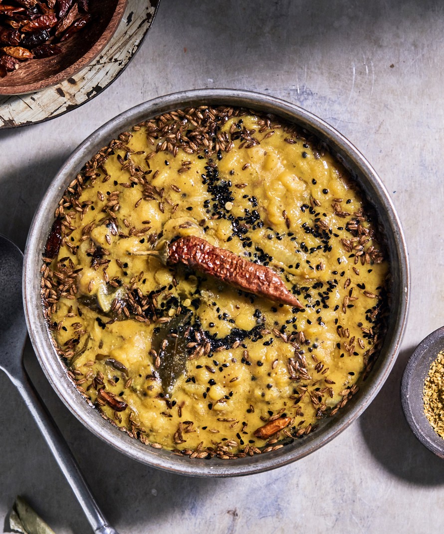 Valmista chhonk. Kuumenna ghee tai öljy pienessä valurautapannussa. Kun öljy on todella kuumaa, lisää mausteet ja paista sekoittaen 1 minuutti. Kaada kuuma mausteöljy linssimuhennoksen päälle. Tarjoa vadojen tai riisin kanssa.