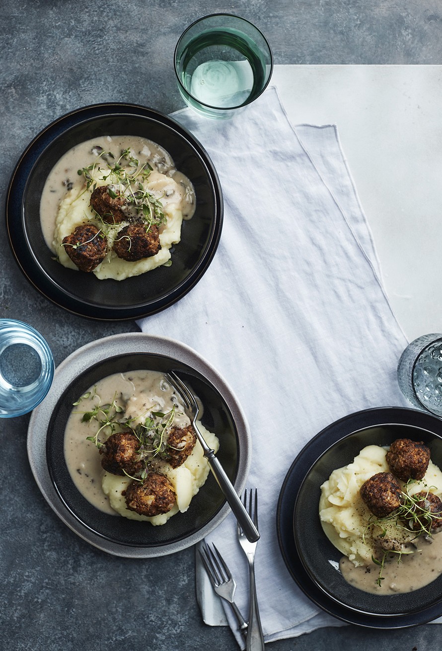 Mehevät lihattomat pullat on nopea pyöräyttää soijarouheesta. Täyteläinen kastike syntyy pippurikaurakermasta kuin itsestään.