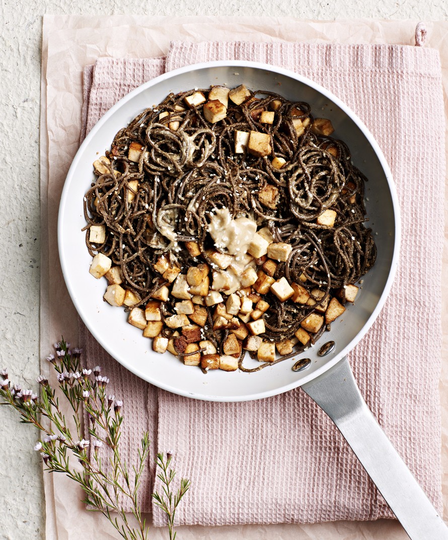 Paista tofukuutioita pannussa öljyssä 3–4 minuuttia tai kunnes ne ovat kauniin ruskeita. Lisää nuudelit, seesaminsiemenet ja kastike pannuun. Kuumenna. Tarjoa heti.