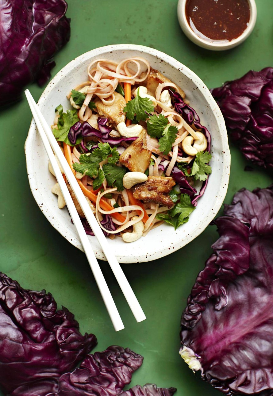 - Lisää vegekanapalat nuudelisalaatin joukkoon. Silppua sekaan reilusti tuoretta korianteria ja ripottele cashewpähkinät joukkoon.