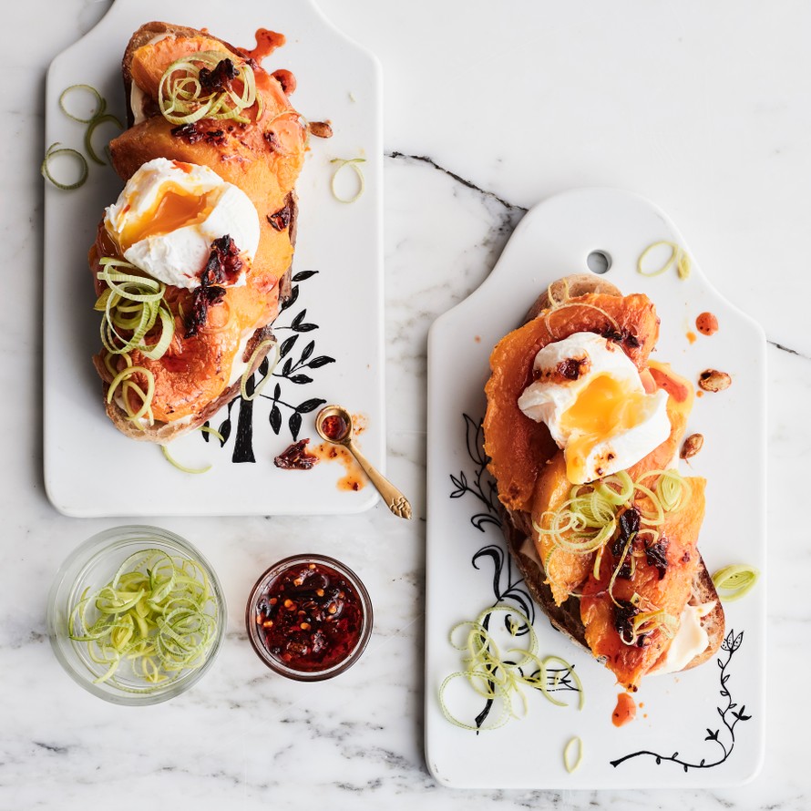 Leikkaa kuori pois kypsistä kurpitsaviipaleista. Lusikoi kimchiä leiville ja lado kurpitsaviipaleita päälle. Laita jokaiselle leivälle uppomuna ja ripottele munan päälle sormisuolaa. Viimeistele leivät purjolla ja rapealla chiliöljyllä.