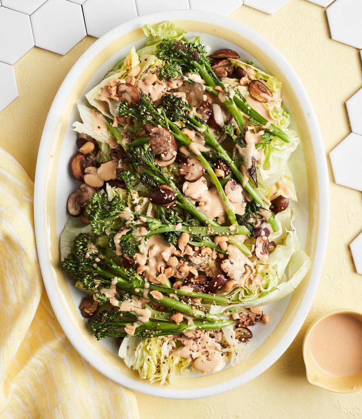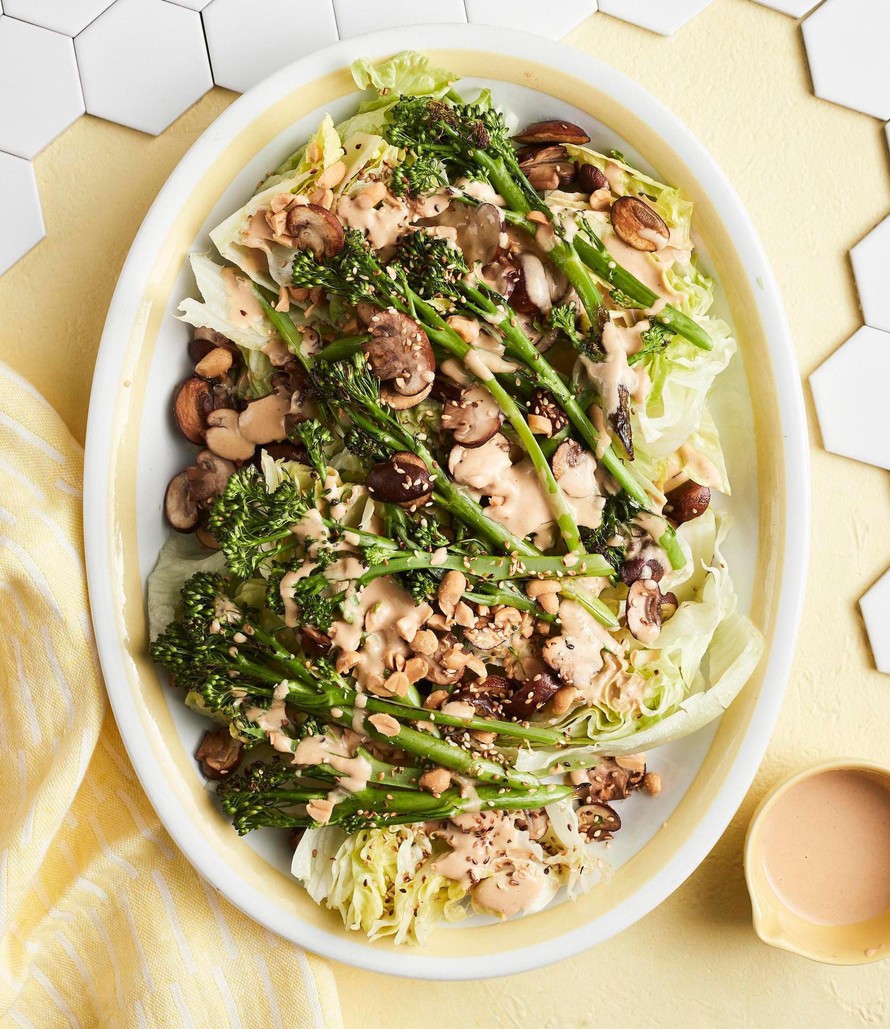 Laita herkkusienet ja varsiparsakaalit vadille jääsalaatin päälle, lusikoi kastike salaatille ja viimeistele seesaminsiemenillä ja pähkinärouheella.