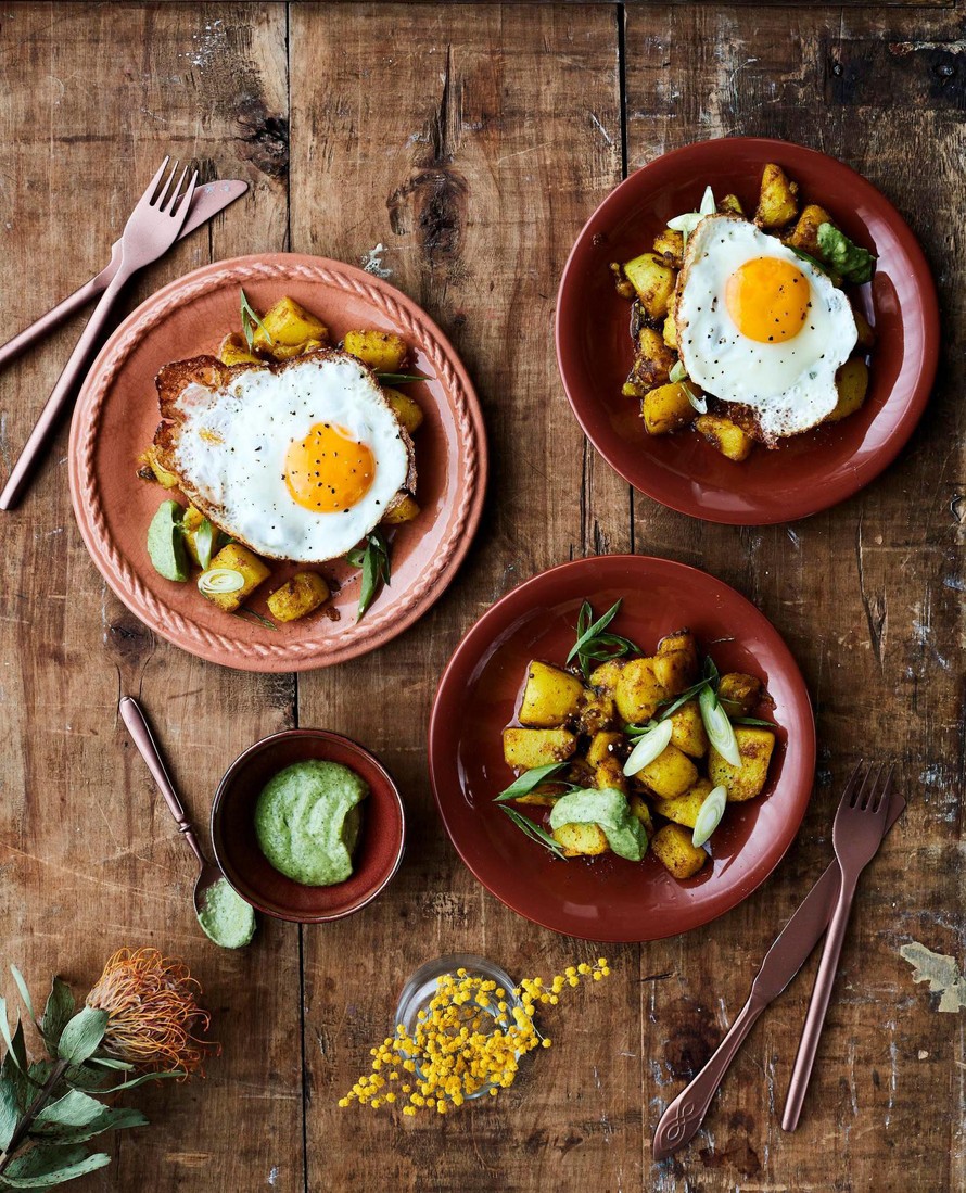 Mausteita tulvivat paistetut perunat tarjotaan kananmunien ja vihreän chutneyn kanssa. Täydellistä brunssiruokaa!