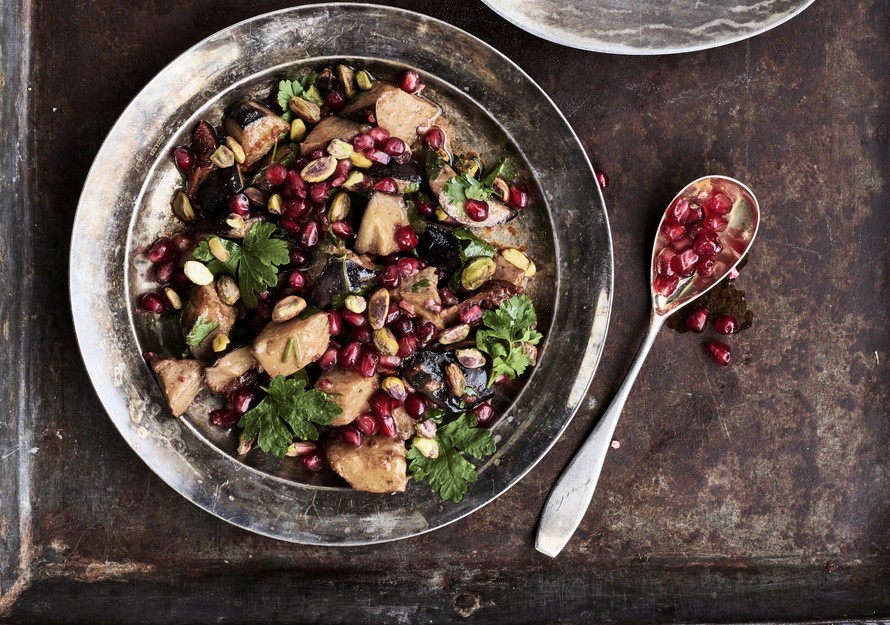 Granaattiomena sopii täydellisesti harissalla ja tahinilla maustettuun munakoisopannuun. Tarjoa pannu salaattina tai lisukkeena.