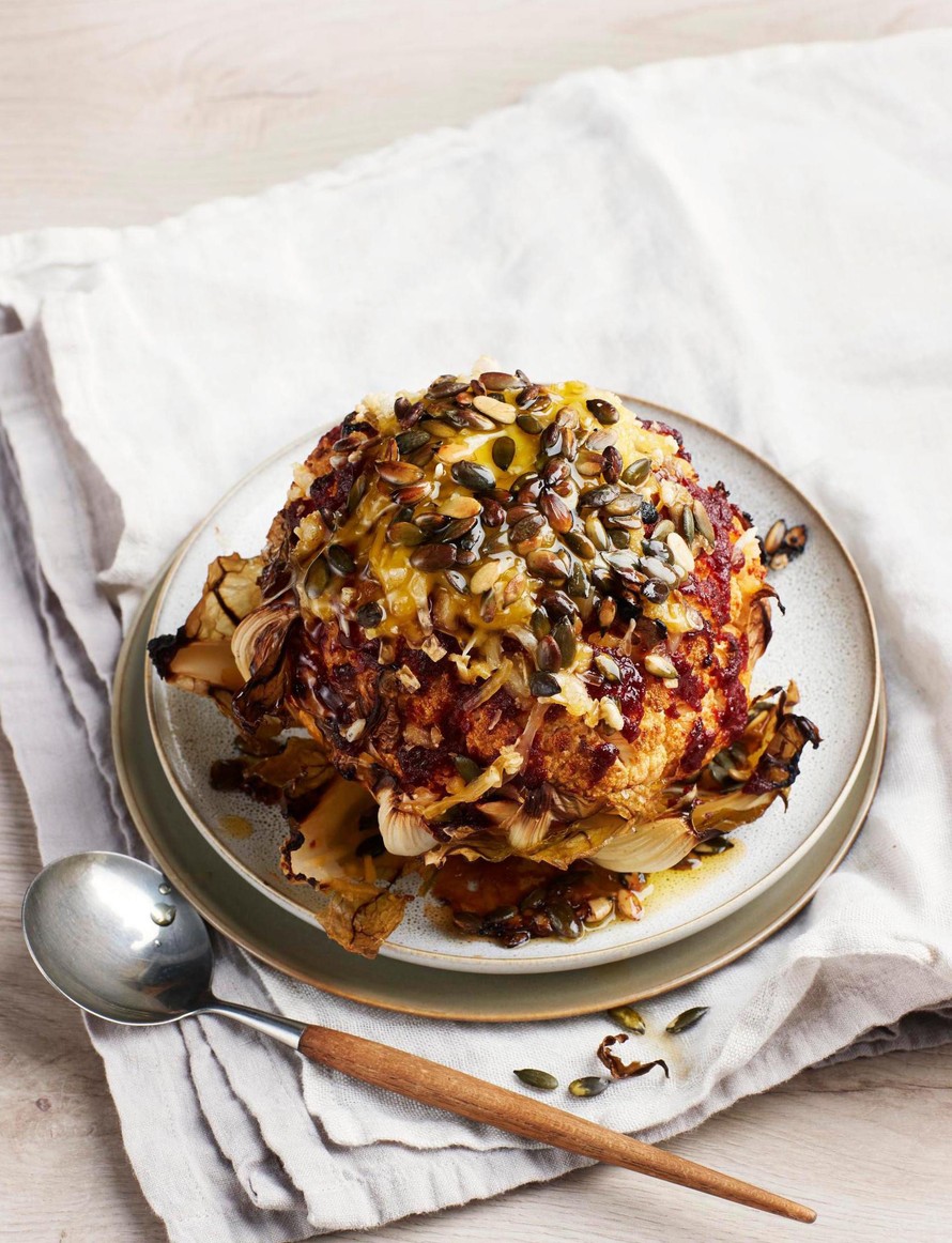 Kokonainen kukkakaali kypsyy uunissa meheväksi. Sen koloihin on kätketty runsaat määrät valkosipulia.