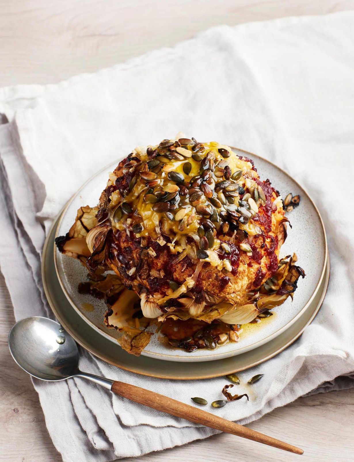 - Sekoita raasteen joukkoon öljy. Levitä juusto kukkakaalin päälle ja ripottele pinnalle kurpitsansiemeniä. Jatka gratinointia 10 minuuttia.